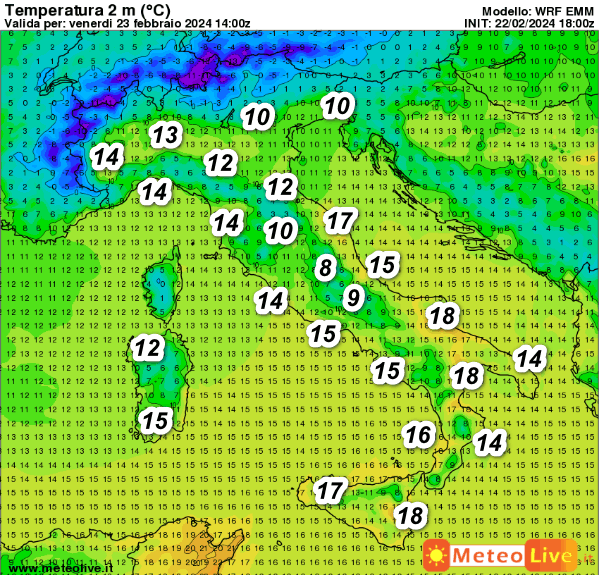 Punte di 17-18° in Sicilia, sulla Puglia e lungo il versante adriatico. Un po’ più basse le temperature nelle aree interne dell’Italia centrale.