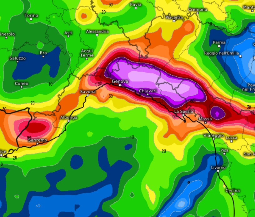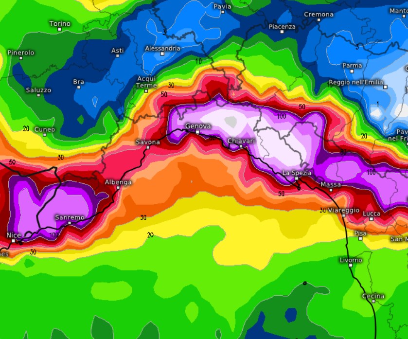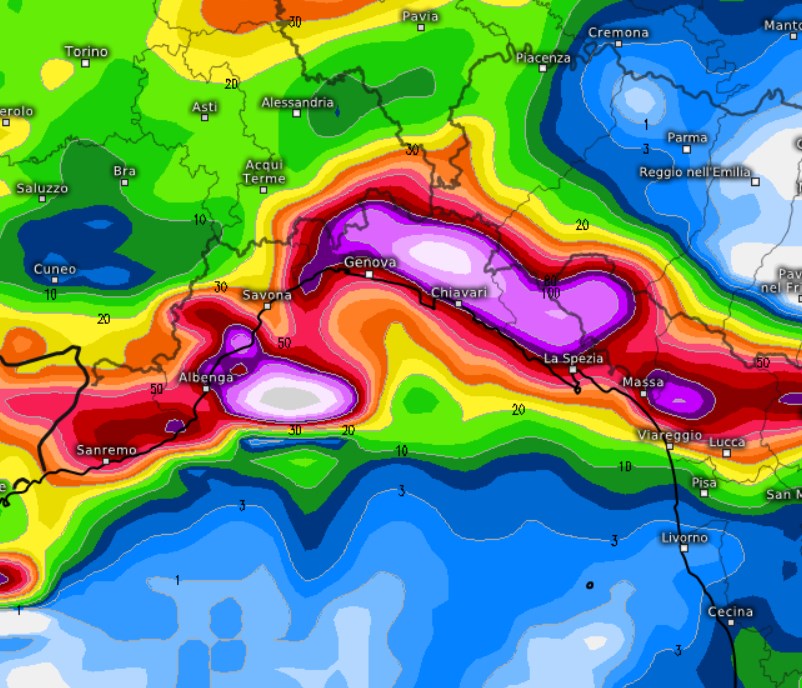 Mediamente il modello stima oltre 150mm di pioggia, con punte fino a 260mm fra Genova e Chiavari, sull’Appennino, una quantità allarmante.