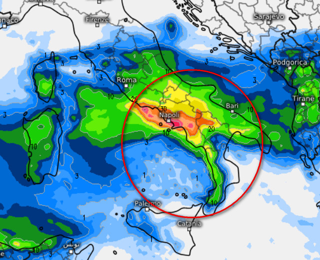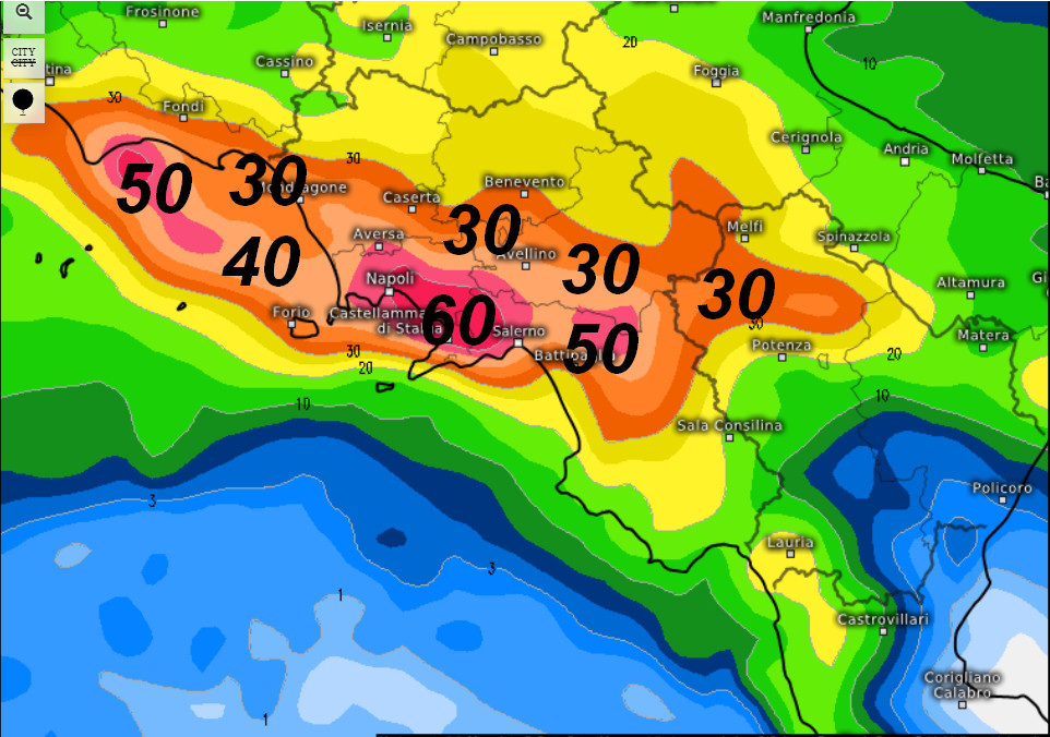 Piogge intense nell’ordine dei 60mm, colpiranno la fascia costiera posta tra Napoli e Salerno, ma 40-50mm saranno possibili anche sul Golfo di Gaeta, nella zona di Battipaglia fino a sfiorare il Potentino. Dove vedete il colore giallo le piogge saranno attorno a 30mm, mentre il verde testimonia piogge tra i 10 ed i 20mm.