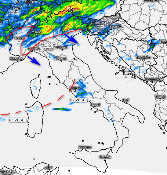 Forti temporali accompagnati da grandine e colpi di vento su Piemonte orientale, Lombardia, Liguria centrale, Emilia ed in tendenza verso il Triveneto. Rovesci occasionalmente temporaleschi interverranno anche lungo un’ipotetica linea compresa tra la Sardegna settentrionale e il Lazio, per il resto assenza di fenomeni.