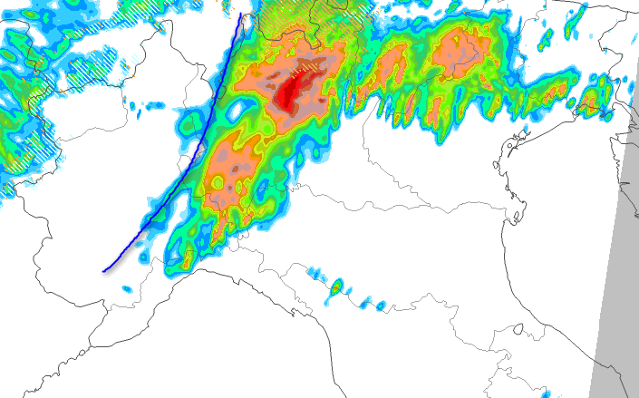 Si nota la linea temporalesca distesa tra l’est del Piemonte, la Lombardia e la Liguria centrale, in spostamento verso levante. Attenzione agli accumuli piovosi elevati tra il nord-est della Lombardia ed il Triveneto.