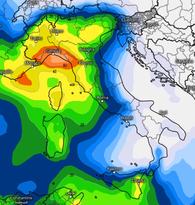 Questa vasta area depressionaria, avvicinandosi alla penisola italiana, richiamerà venti umidi da sud, che, caricandosi di umidità sul Mediterraneo, alimenteranno la formazione di intense celle temporalesche. Se questa previsione sarà confermata, prepariamoci a nubifragi, soprattutto in Liguria e parte del Piemonte, con accumuli di pioggia che potrebbero localmente superare i 90 mm in poche ore, stando alle ultime elaborazioni dei modelli fisico-matematici e in particolare provenienti dal modello ECMWF con intelligenza artificiale, che per quanto poco dettagliato e a bassa risoluzione, ha una buona affidabilità a medio e lungo termine: