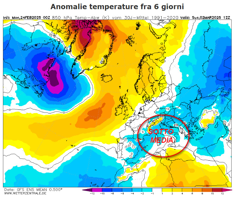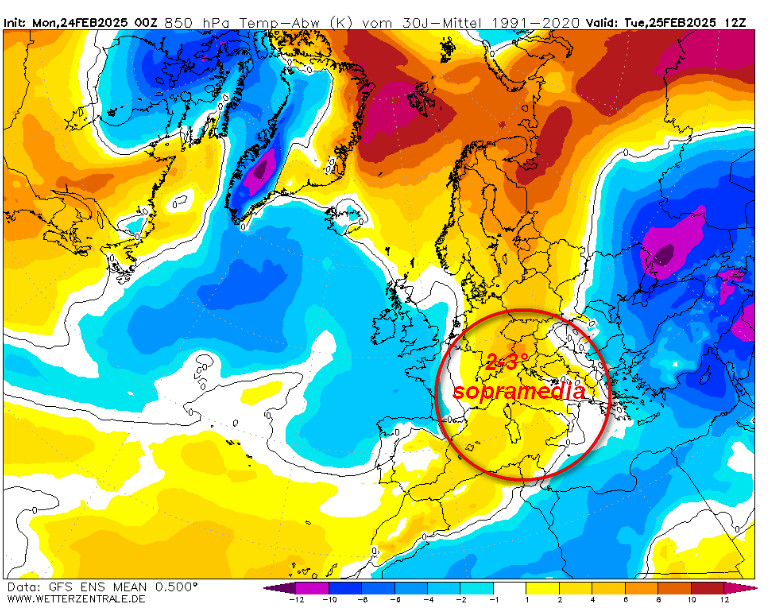 La prima mappa mostra le anomalie termiche a 1500 metri attese in Europa nelle ore centrali di martedi 25 febbraio: