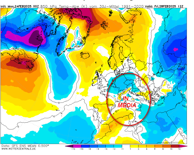 Volgendo lo sguardo oltre ed arrivando alla giornata di venerdi 28 febbraio, ultimo giorno dell’inverno meteorologico, le anomalie termiche a 1500 metri a scala europea saranno le seguenti: