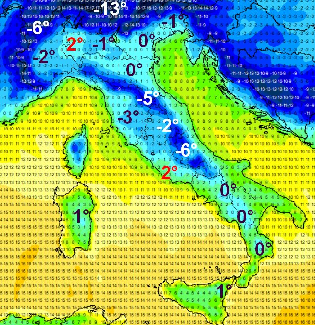 In ogni caso le temperature scenderanno abbondantemente al di sotto dello zero lungo le Alpi con valori anche inferiori ai -10°C nelle vallate superiori ammantate di fresco dalle nevicate, ma potranno toccare punte di -5/-6°C anche nei fondovalle.