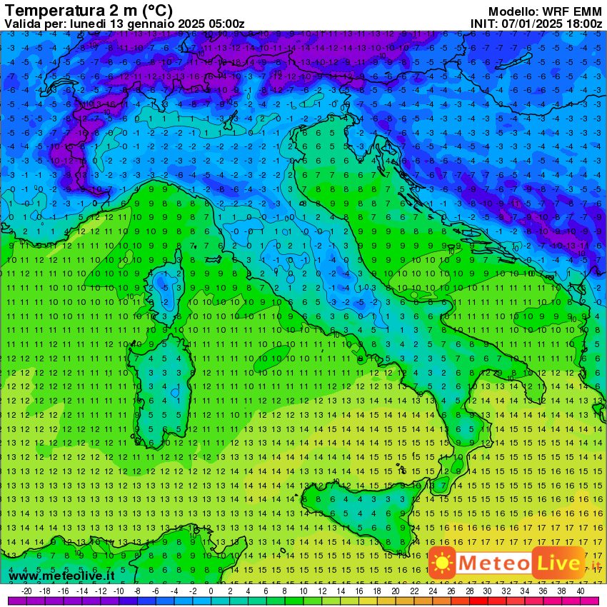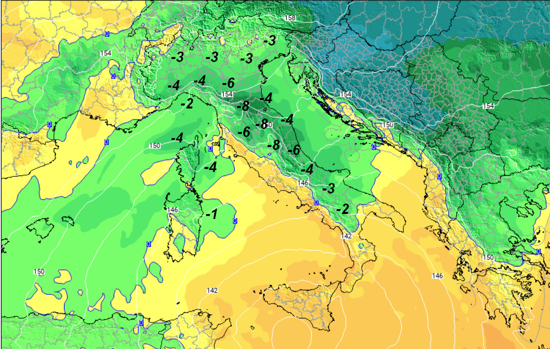 Il momento più freddo per l’Italia sarà la mattinata di lunedi 13 gennaio. Iniziamo con le temperature previste a 1500 metri per il momento in questione: