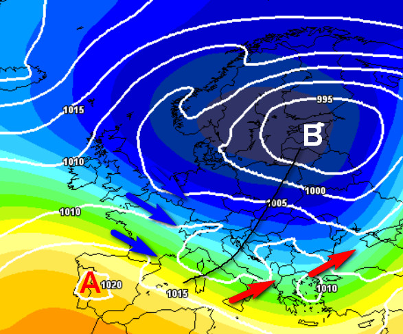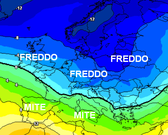 Si nota il lago freddo presente su quasi tutta l’Europa centro-settentrionale, con un’estensione parziale ad alcuni settori del settentrione e nel centro. Questo significa che in occasione di eventuali precipitazioni, la quota neve potrebbe essere piuttosto bassa in questi comparti.