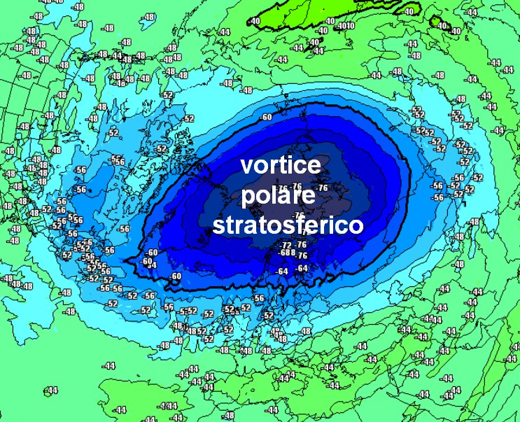 E’ possibile che questa congiuntura barica si modifichi e che anche l’Europa assista ad una fase fredda? AL momento tutto questo NON si vede almeno sino all’inizio di febbraio, il vortice polare stratosferico è chiuso e compatto (mappa sotto) e quello troposferico è allungato sugli States.