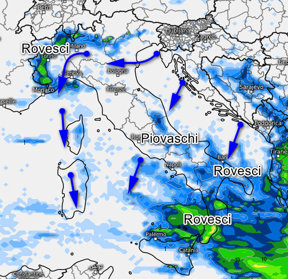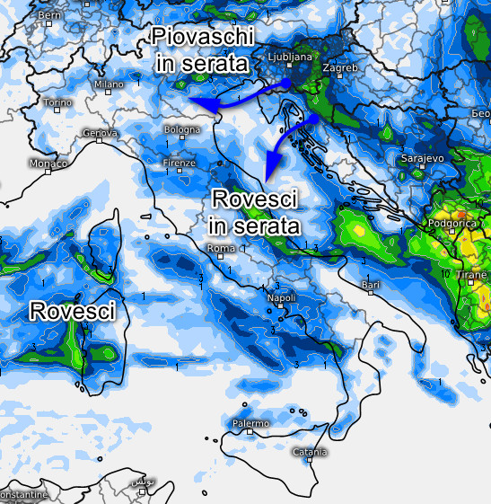 La giornata partirà con qualche rovescio sulla Sardegna e il medio-basso Tirreno; tempo abbastanza stabile altrove. Tra pomeriggio e sera inizierà il travaso di aria fredda dalla Porta della Bora che porterà alcuni rovesci al nord-est, sulle Marche, in Abruzzo ed in Molise, nevosi oltre i 1200 metri. Sul resto d’Italia prevalenza di momenti asciutti e clima ancora mite.