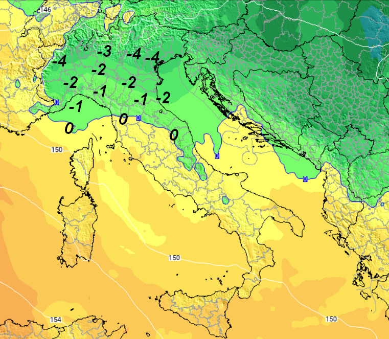 Al settentrione si prevedono isoterme alla medesima quota comprese tra -2 e -4°, mentre al centro l’isoterma 0° riuscirà a toccare a malapena l’Appennino, lasciando indenne il settore tirrenico, oltre ovviamente a tutto il meridione che manterrà isoterme a 1500 metri al di sopra dello zero.