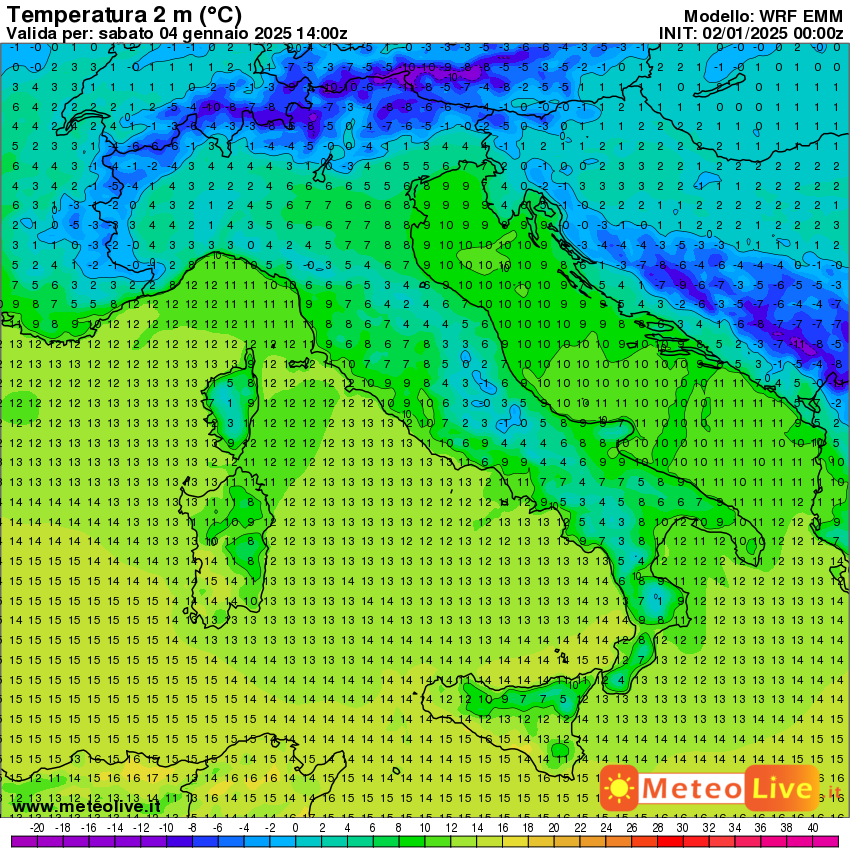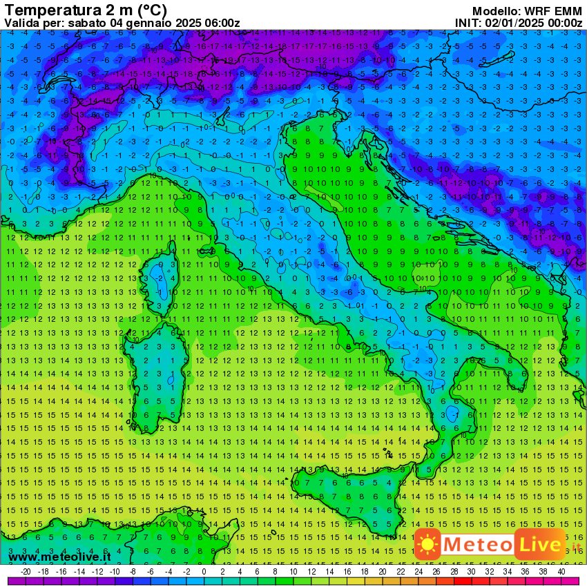 Infine, queste sono le temperature previste in Italia alle ore 15 di sabato 4 gennaio:
