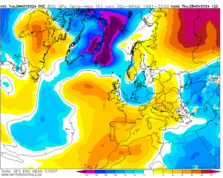 Iniziamo con le anomalie termiche a 1500 metri attese in Europa nelle ore centrali di giovedi 28 novembre: