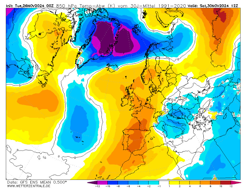 Osserviamo adesso le anomalie termiche sempre a 1500 metri attese in Europa nelle ore centrali di sabato 30 novembre, ultimo giorno dell’autunno meteorologico.