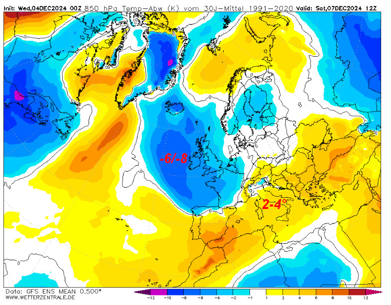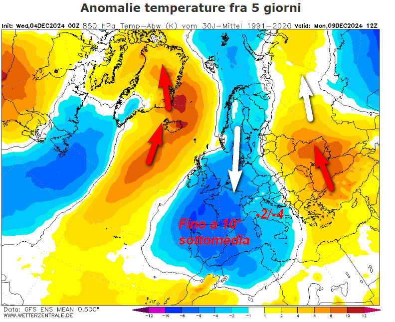 Davvero suggestiva questa mappa. Notate le due intrusioni di aria mite verso nord (frecce rosse) a cui farà da controaltare un ampio pendolo freddo che interesserà quasi tutta l’Europa centro-occidentale, compresa l’Italia. Tra la Francia occidentale e la Penisola Iberica si prevedono temperature a 1500 metri addirittura fino a 10° inferiori alla media del periodo. Sull’Italia si avranno invece tra i 2-4° di temperature inferiori al normale, con punte di 4-6° sulla Sardegna ed estremo nord-ovest.
