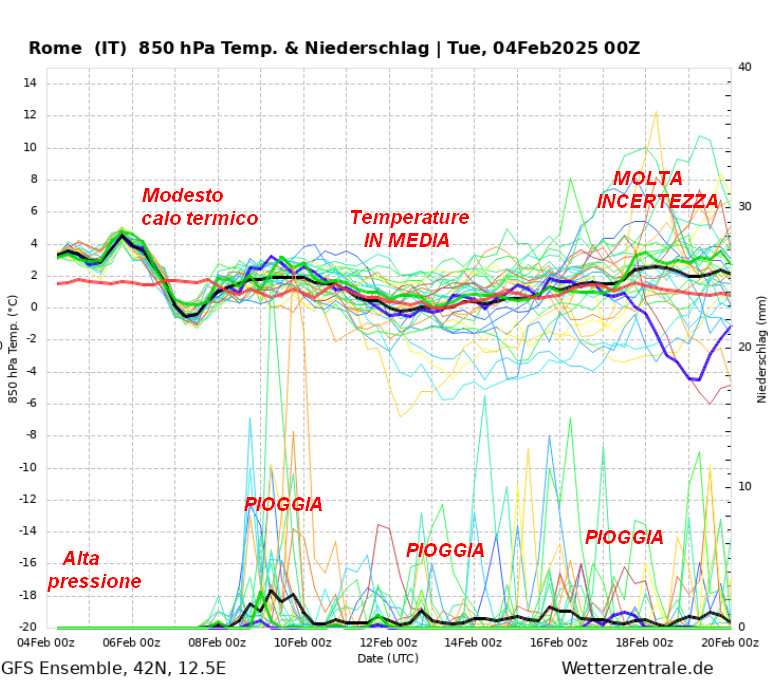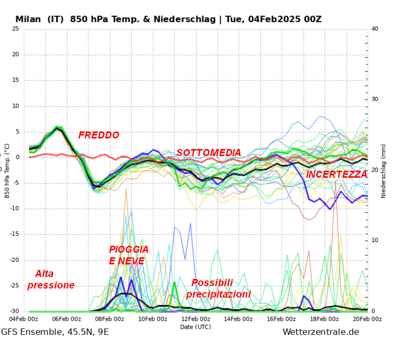 La linea ROSSA indica la media degli ultimi 30 anni (1991-2020): linee sopra la linea rossa indicano quindi scenari con temperature sopra la media, linee sotto la linea rossa indicano invece scenari con temperatura sotto alla media. Nella parte più bassa le linee mostrano la quantità di pioggia prevista.