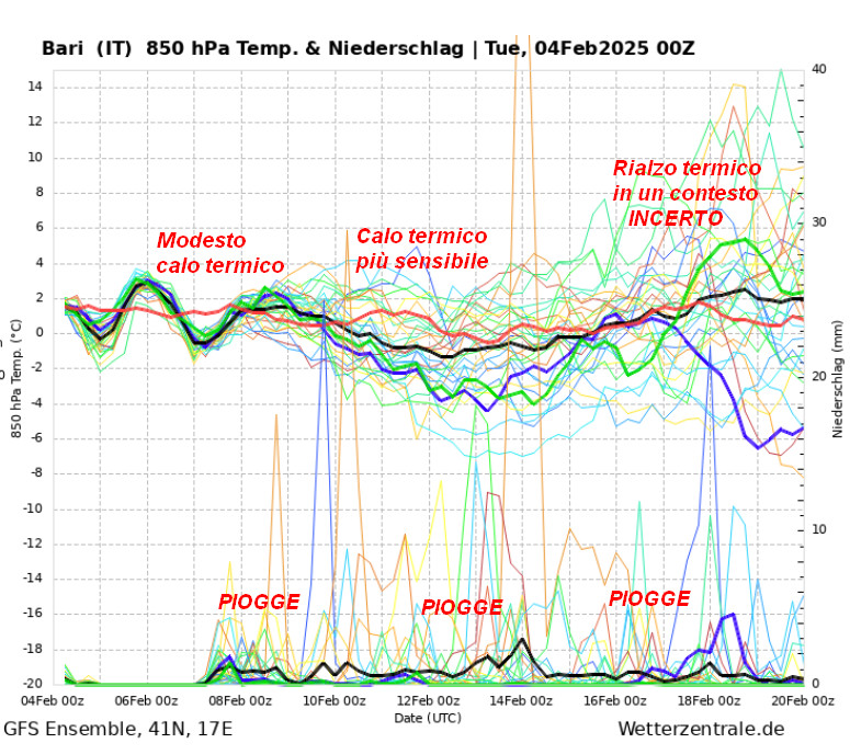 Temperature altalenanti fino al 10 febbraio con fasi più miti alternate a brevi periodi relativamente freddi. Un calo termico più consistente potrebbe intervenire tra il 10 e il 15 febbraio, con anche alcune precipitazioni (nevose sui rilievi appenninici meridionali). Il contesto termico diviene molto incerto dopo il giorno 15 febbraio anche se la tendenza pare sia al rialzo.
