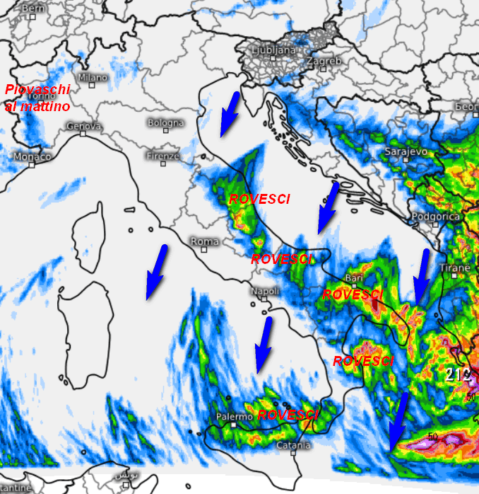 Rovesci saranno ancora presenti su Marche, Umbria orientale e Abruzzo. Tempo molto instabile anche al meridione con acquazzoni su nord Sicilia, Calabria meridionale ed orientale, Puglia, Molise e Lucania. Si tratterà di acquazzoni accompagnati da forti venti settentrionali e da un sensibile calo delle temperature. Non sono esclusi temporali con grandine. Al nord ultimi piovaschi sulle Alpi occidentali al mattino in via di attenuazione, altrove tempo nel complesso soleggiato e limpido, così come sul Tirreno e la Sardegna. Temperature in calo su tutta l’Italia.