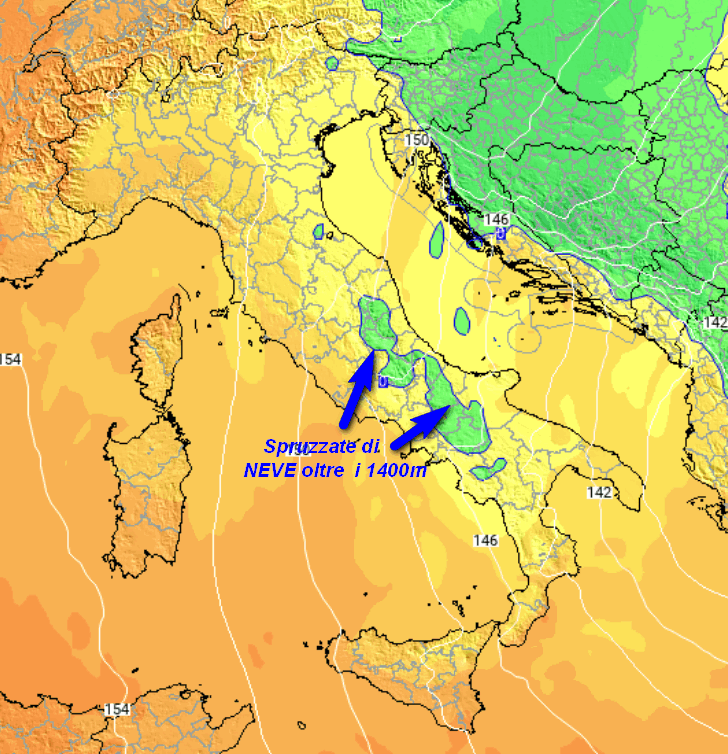 Nelle aree interne del centro e parte del meridione comparirà l’isoterma di 0° alla quota sopra indicata. Ciò potrebbe consentire brevi spruzzate di neve sull’Appennino abruzzese e molisano oltre i 1400 metri. Si tratterebbe comunque di fiocchi residui in quanto la situazione tenderà a migliorare. Nevicate ben più copiose sono attese sulle medesime aree oltre i 1800-2000 metri specie nel comprensorio del Gran Sasso e della Majella a partire dalla serata di mercoledi 1 e per tutto giovedi 2 ottobre.
