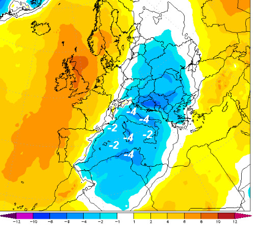 4° sotto media si prevedono sulla Sardegna orientale, lungo il versante adriatico e le aree interne del centro-sud compresa l’Emilia Romagna. Altrove avremo anomalie termiche alla medesima quota comprese tra 1 e 3° al di sotto della media.