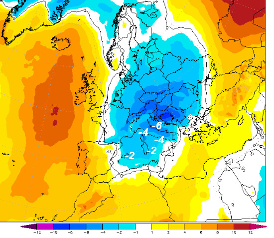 Queste invece sono le anomalie termiche sempre a 1500 metri, attese in Italia nelle ore centrali di lunedi 13 gennaio: