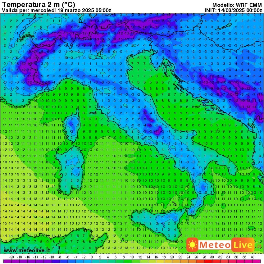 Punte di -2/-3° saranno probabili anche in pianura tra il basso Piemonte, la bassa Lombardia (probabilmente 0°C a Milano città) e l’Emilia Romagna. Andrà anche peggio nelle vallate interne dell’Appennino centrale dove si potrebbero toccare i -5/-6°. Si tratterà di temperature che si registreranno all’alba; non appena il sole sorgerà, il termometro salirà velocemente sopra lo zero, anche se non avremo mitezza nemmeno durante il giorno.