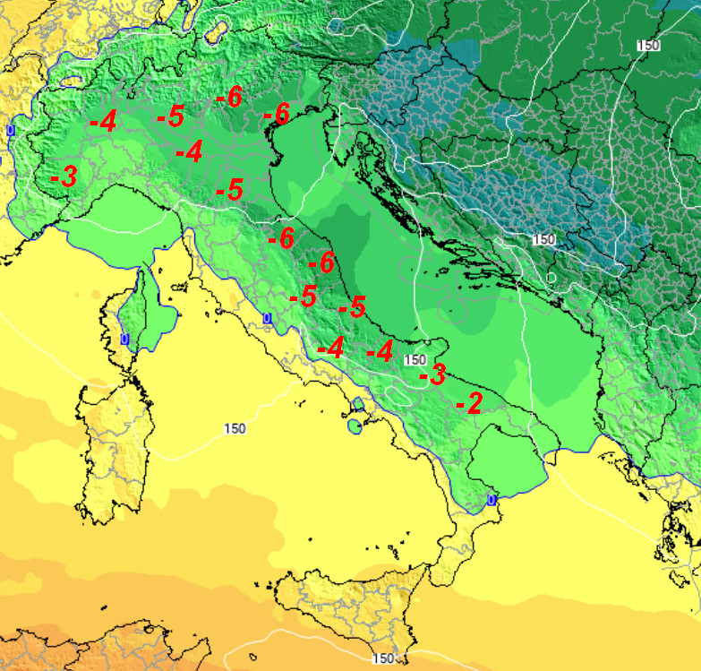 Su diverse aree del nord (specie al nord-est) le zone interne del centro e lungo il versante adriatico arriveranno isoterme alla medesima quota comprese tra -4 e -6°.