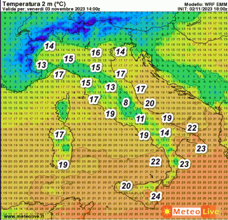 Valori molto freschi al nord e nelle aree interne dell’Italia centrale. Ancora mite all’estremo sud con punte di 24° sulla Sicilia orientale.
