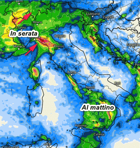 Occupiamoci adesso del tempo odierno con la sommatoria delle precipitazioni attese in Italia fino alle ore 7 di domani mattina, sabato 4 novembre: