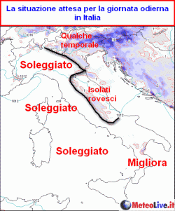 Tuttavia, un flusso di correnti in quota da nord-ovest toccherà ancora oggi parte del nord-est e la dorsale appenninica centrale, dove nel pomeriggio non si esclude la possibilità di qualche isolato rovescio o temporale, che tenderà ad attenuarsi al calare del sole.