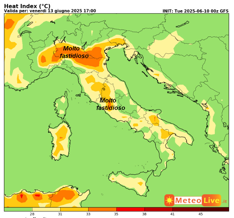Questo invece è l’indice di disagio da caldo previsto in Italia alle ore 17 di venerdi 13 giugno: