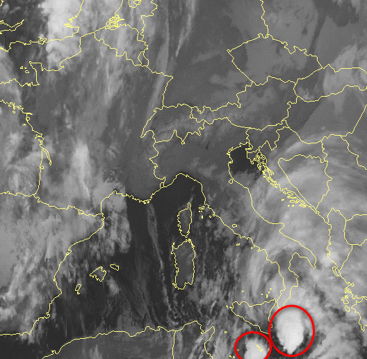 Focalizziamo lo sguardo in basso a destra dove agiscono importanti celle temporalesche che se dovessero impattare sulla terraferma potrebbero originare anche dei problemi. Oltre a ciò ci sono da segnalare le nevicate sull’Appennino centrale in media sopra gli 800-1000 metri con accumuli anche consistenti nella zona del Gran Sasso e della Maiella. Sul resto d’Italia il tempo si presenta asciutto, ma come già detto, più freddo.