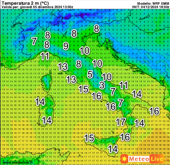 Passiamo adesso al quadro delle temperature attese in Italia alle ore 14 di giovedi 5 dicembre: