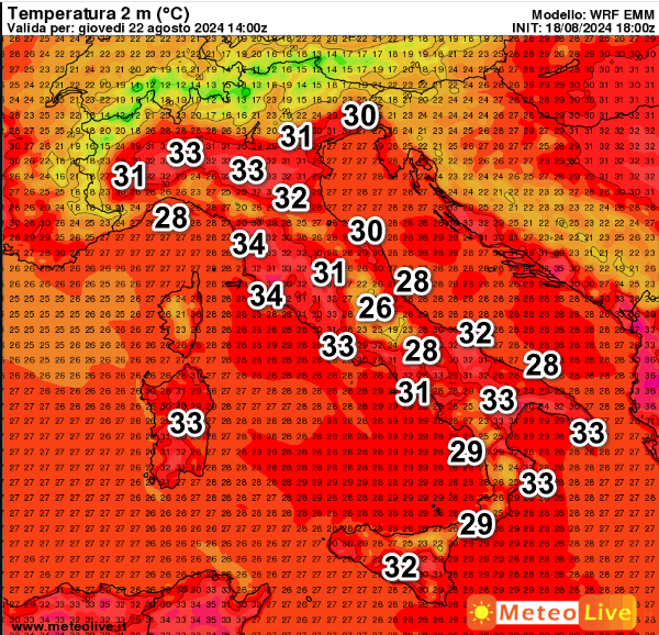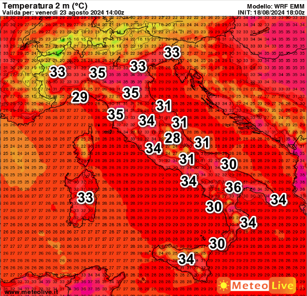 Infine, queste sono le temperature previste in Italia alle ore 16 di venerdì 23 agosto: