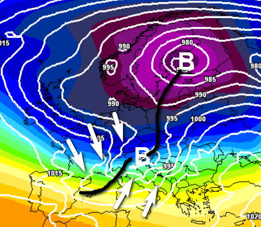 Notiamo un nido di isobare molto fitte in Italia, segno di turbolenze e vento forte. Incastonata in un’ansa depressionaria ritroviamo la perturbazione che nella giornata di venerdi darà luogo a MALTEMPO al CENTRO-SUD.