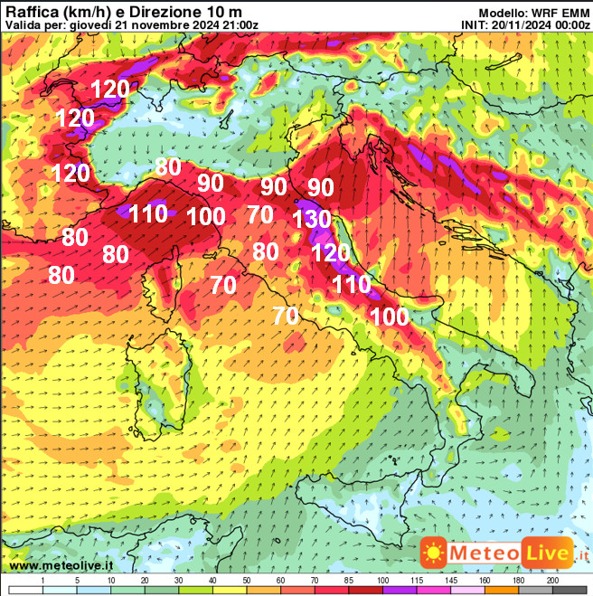 Passiamo adesso alla tempesta di vento che interesserà la nostra Penisola nella serata di domani, giovedi 21 novembre. La mappa è incentrata per le ore 22: