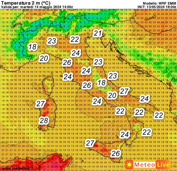 Dal punto di vista termico, queste sono le temperature attese in Italia alle ore 16 della giornata odierna, martedi 14 maggio: