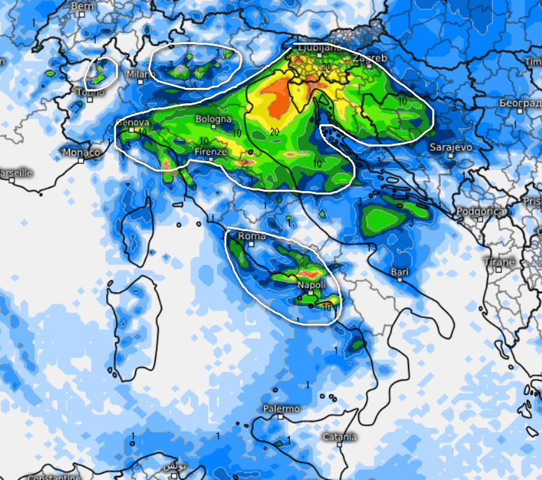 Piogge sparse e qualche rovescio tra la Liguria centro-orientale, l’Emilia Romagna, le coste Venete e Giuliane oltre alle Marche. Qualche rovescio sembra probabile anche sull‘alto Piemonte e tra la Lombardia e il Veneto. Piovaschi non esclusi nell’arco della giornata tra il basso Lazio e la Campania, mentre sulle restanti regioni avremo annuvolamenti anche compatti, ma con basso rischio di fenomeni.