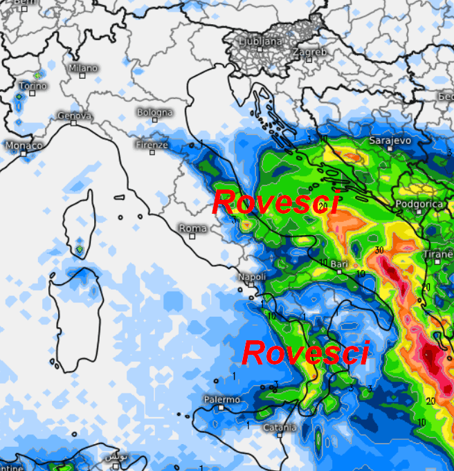La prima mappa mostra le precipitazioni attese in Italia nell’arco di domenica 5 ottobre: