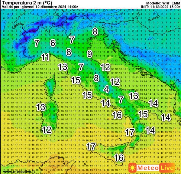 Sul fronte delle temperature, questi sono i valori attesi in Italia alle ore 15 di giovedi 12 dicembre: