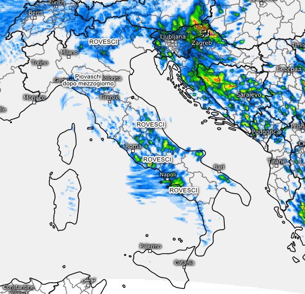 Soleggiato al nord-ovest tranne gli ultimi piovaschi sull’Appennino Ligure orientale, in attenuazione. Rovesci tra alto Veneto, Trentino ed in modo irregolare nelle aree interne del centro-sud. Acquazzoni comunque più intensi su Campania, Calabria Tirrenica, Molise e Salento.