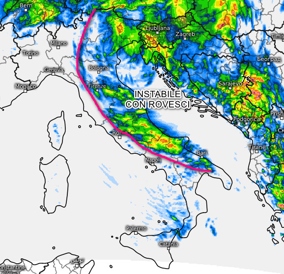 Italia meteorologicamente divisa in due: tempo instabile con rovesci e temporali su Friuli, Romagna, versante adriatico e zone interne dell’Italia centro-meridionale. In questi settori saranno possibili temporali anche accompagnati da grandine. Su tutte le altre regioni tempo soleggiato e limpido, fatta eccezione per qualche piovasco tra la Calabria meridionale e il Messinese. Temperature in calo sui settori orientali dove agiranno venti sostenuti da nord-ovest, temperature invece in aumento al nord-ovest per possibili venti di caduta dalle Alpi.