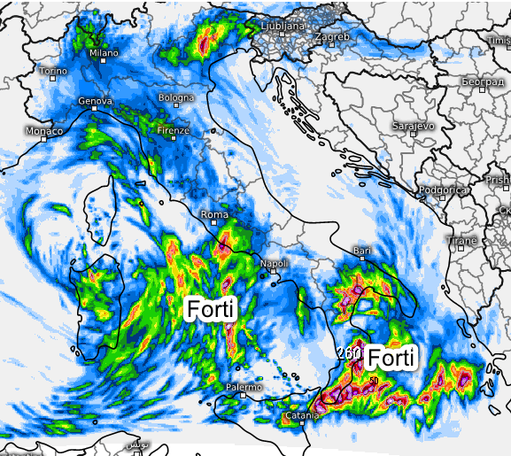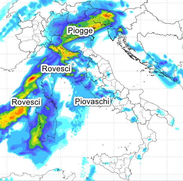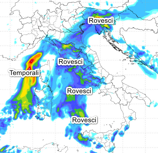 Temporali anche intensi tra il basso Tirreno e la Sardegna, ma soprattutto sulla Calabria Ionica ed il Golfo di Taranto dove saranno possibili nubifragi. Ancora qualche pioggia sulla Toscana ed in rientro da est sul nord-ovest, specie in Liguria. Rovesci anche tra il Veneto orientale ed il Friuli, per il resto assenza di fenomeni.