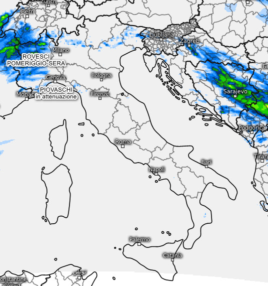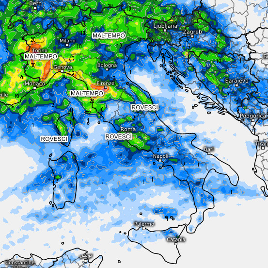 Maltempo soprattutto tra Piemonte, Liguria e Toscana con fenomeni localmente di forte intensità. Piogge a fasi alterne anche sul restante settentrione ad eccezione forse della Romagna, che rimarrà ai margini.