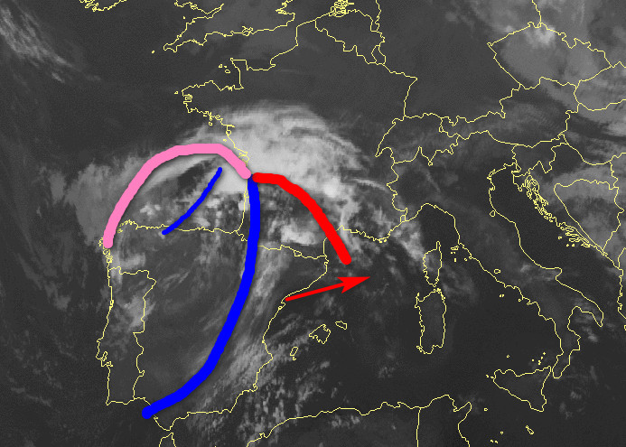 Ecco il sistema frontale che si renderà protagonista nella giornata di martedi 20 maggio su gran parte d’Italia. Si apre a compasso tra la Penisola Iberica e la Francia e tra 24 ore sarà con il suo perno sulla verticale del settore di nord-ovest.