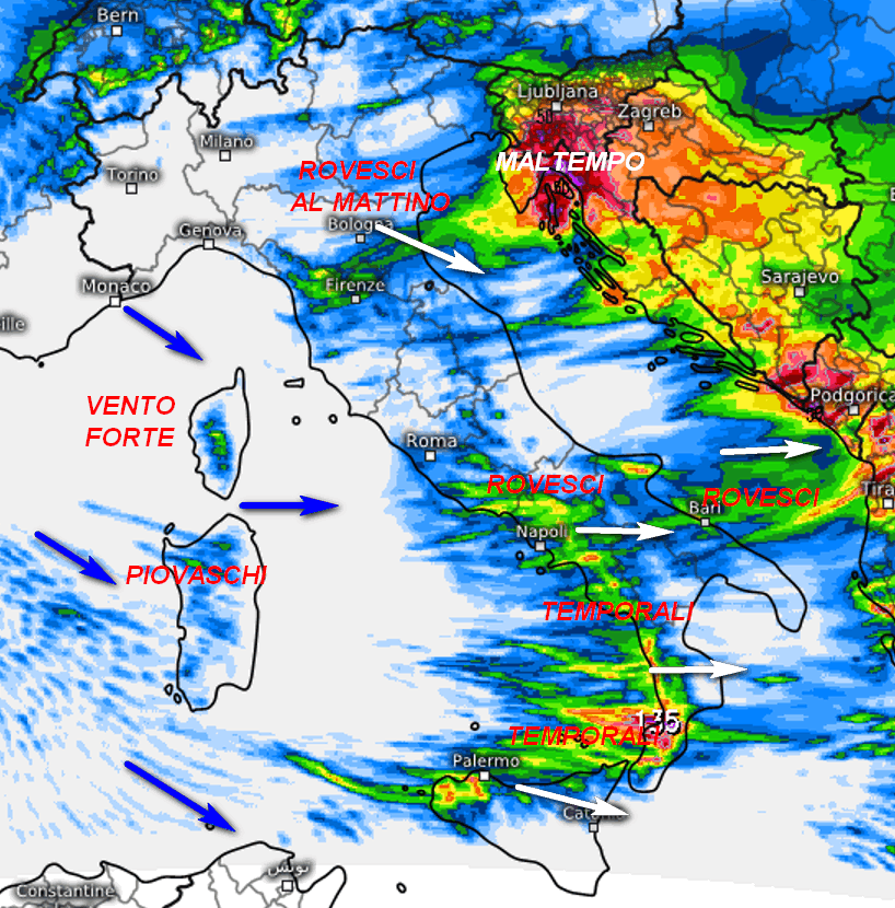 Al mattino piovaschi residui sulla Sicilia settentrionale e sul Salento, ma in definitiva cessazione nell’arco della giornata. Nuvolosità irregolare al nord con piovaschi nel pomeriggio su Liguria ed alta Toscana. Sempre nel pomeriggio, non si esclude qualche goccia di pioggia o pioviggine sull’alta Lombardia, per il resto i fenomeni più intensi saranno ubicati oltralpe. Ancora freddo al mattino al centro e al sud, temperature in generale rialzo durante il giorno, stante una ventilazione più mite da sud-ovest.