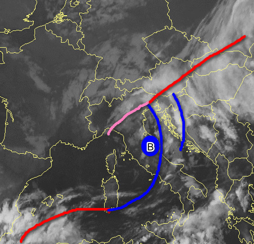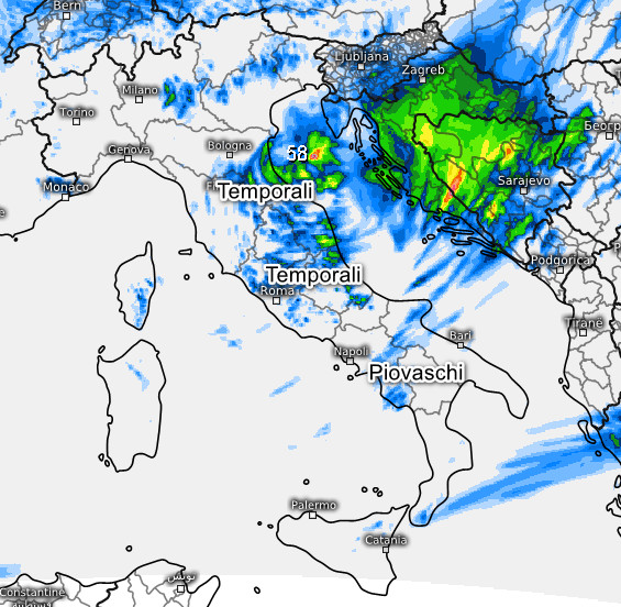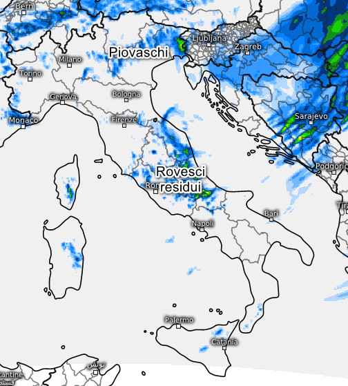 Rovesci o temporali residui tra Marche, zone interne del Lazio e Abruzzo, ma in via di cessazione dopo il tramonto. Qualche piovasco prima del tramonto tra alto Veneto e Friuli, per il resto tempo asciutto.