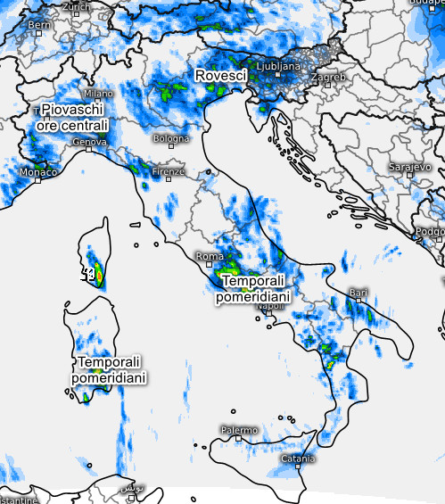 Temporali pomeridiani nel sud della Sardegna e nel Lazio. Piovaschi pomeridiani anche nelle aree interne del meridione e sul nord-est. Sul nord-ovest piovaschi nelle ore centrali della giornata, in via di attenuazione nel pomeriggio, per il resto tempo buono.