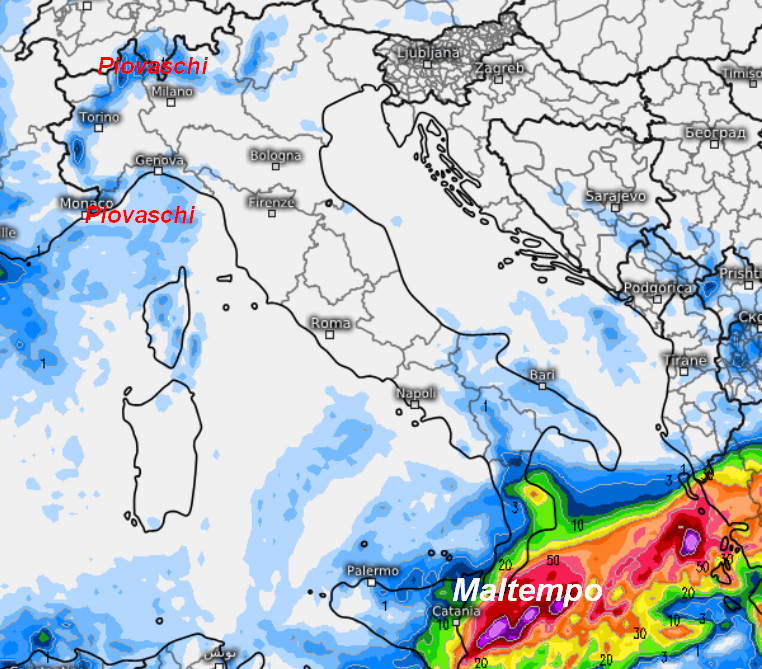 La prima cartina mostra la sommatoria delle precipitazioni attese in Italia nell’arco della giornata di venerdi 17 ottobre: