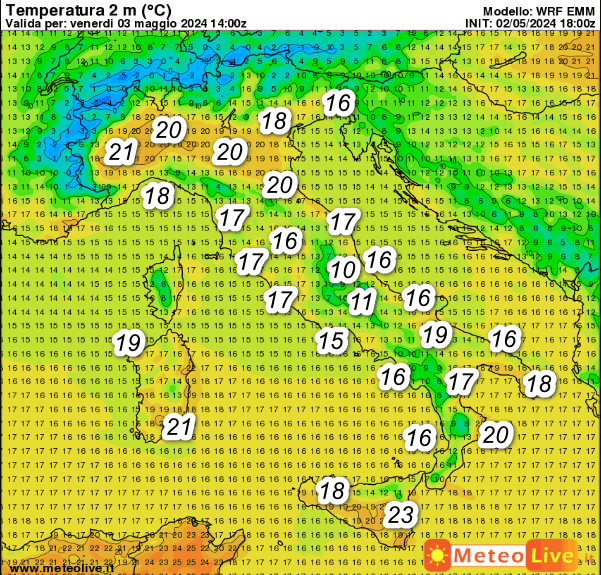 Temperature in aumento al nord. Valori ancora freschi nelle aree interne del centro e del meridione. La punta massima si prevede sulla Sicilia orientale con 23°.
