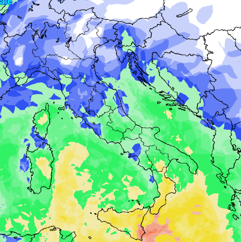 Da questa mappa si nota una maggior probabilità di precipitazioni al centro e al meridione, ma non sono assolutamente esclusi episodi precipitativi anche al nord, che stante le temperature più basse, potrebbero essere nevosi anche a bassa quota.